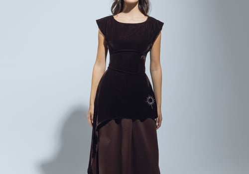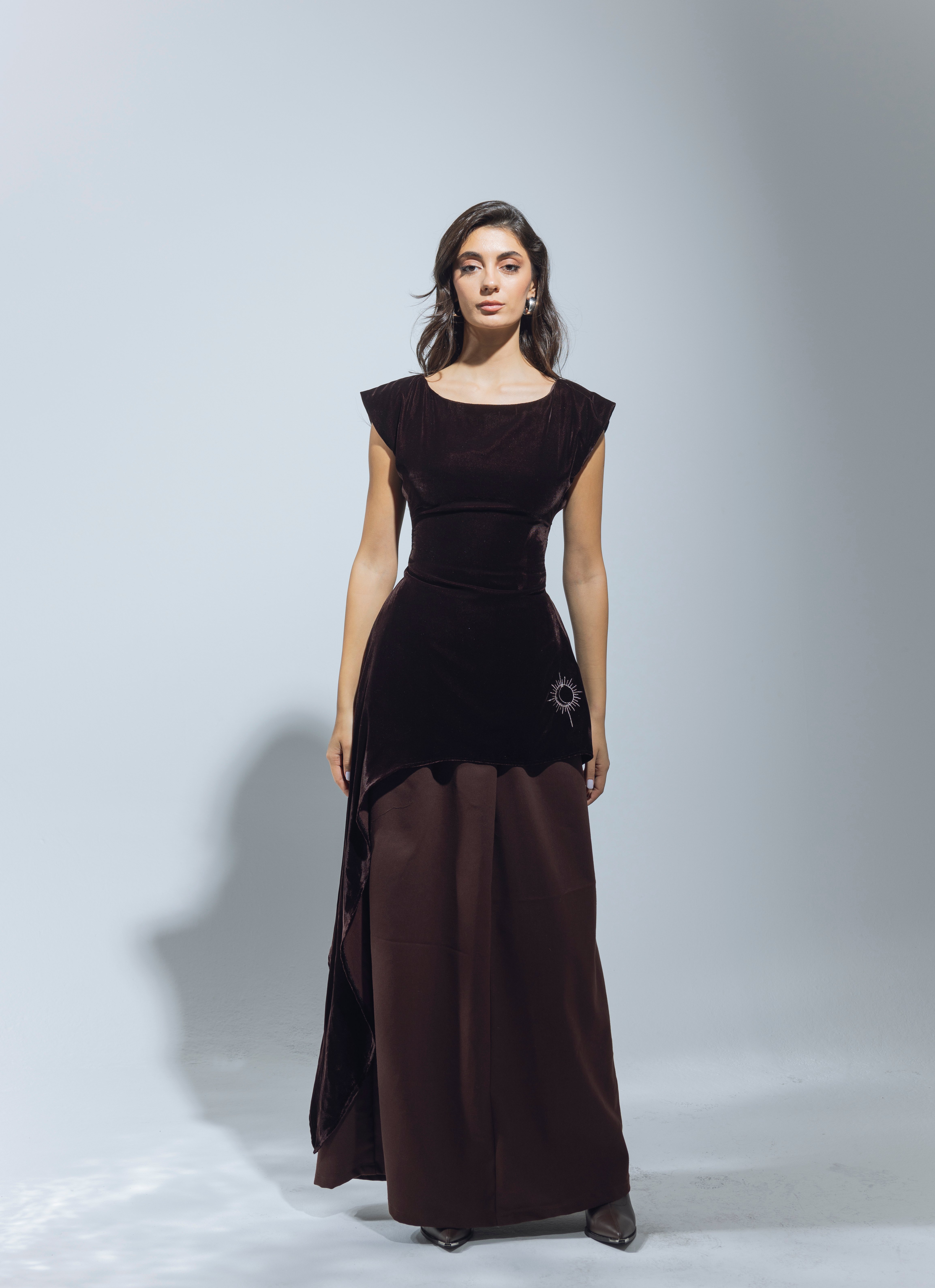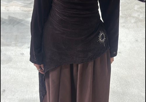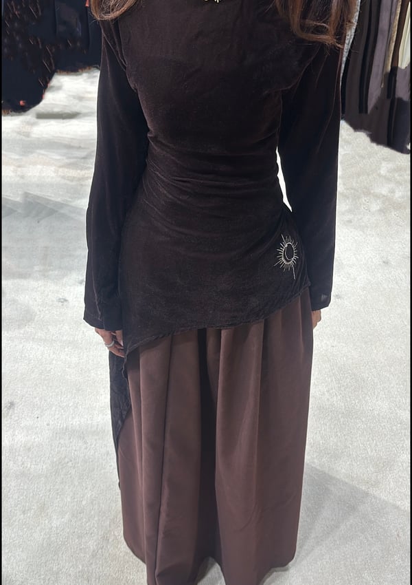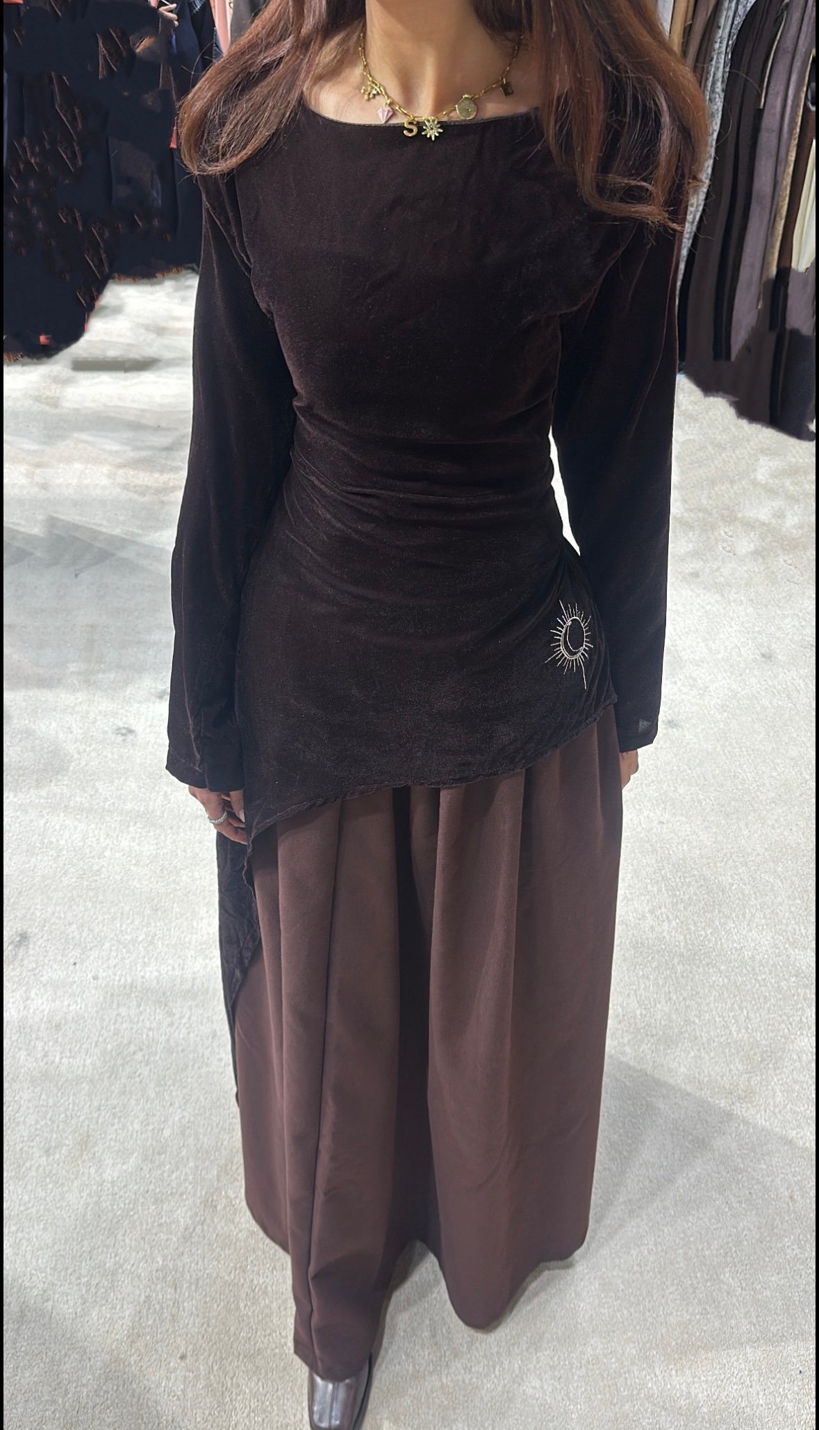 •A set of two pieces features a top crafted from soft brown velvet. The design is asymmetrical, with one side longer than the other. The back of the top is equipped with roping that allows you to tighten and cinch the waist, providing a tailored fit. Delicate silver embroidery adorns the shorter side. Paired with the top is a brown denim skirt that complements the rich hues of the velvet.