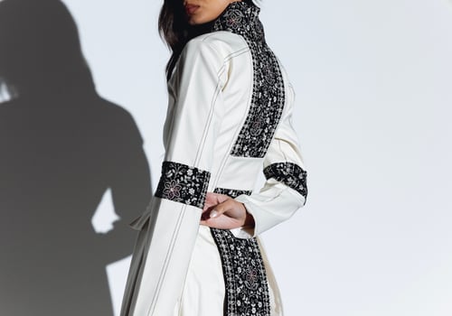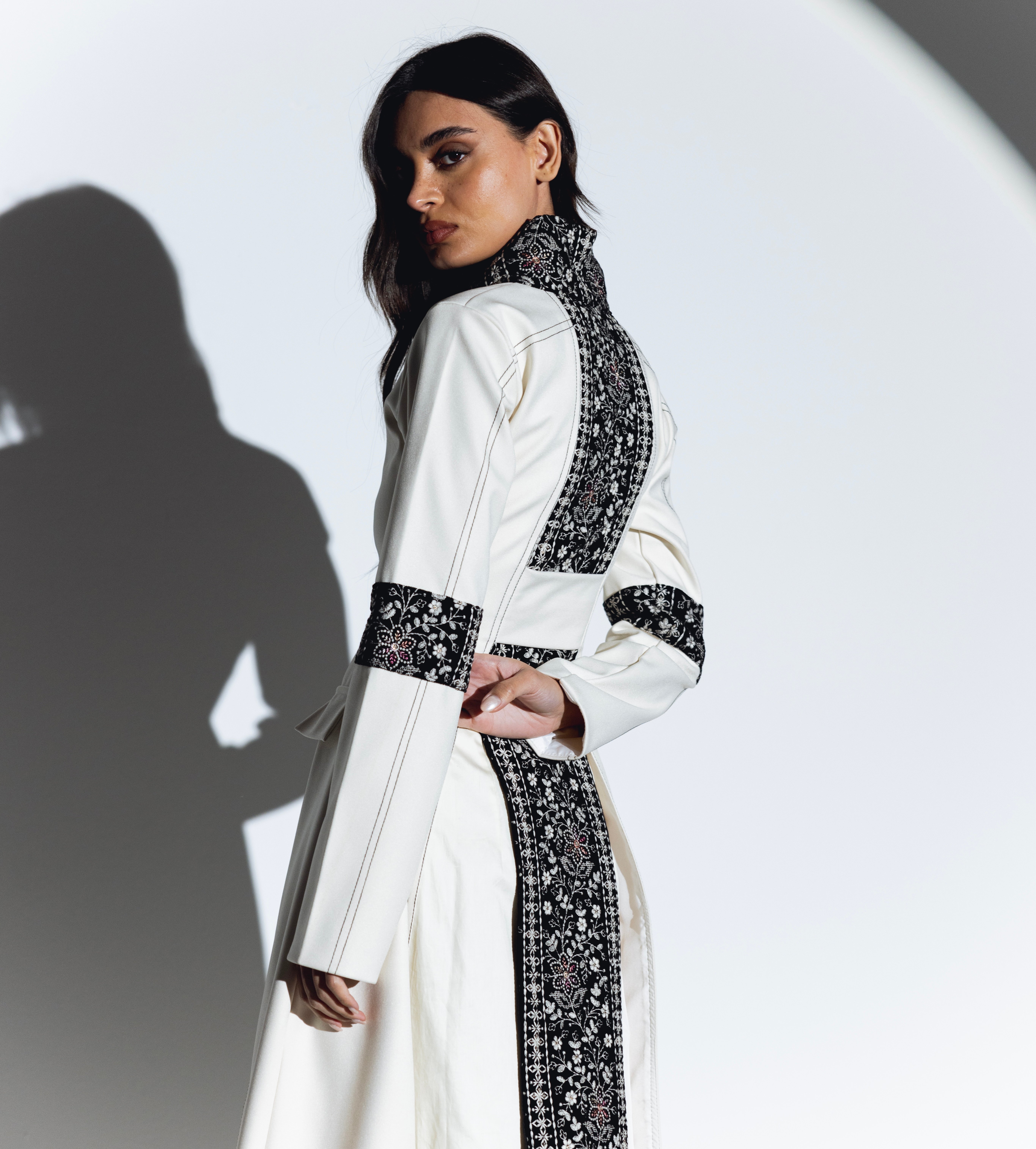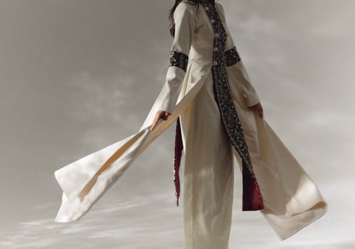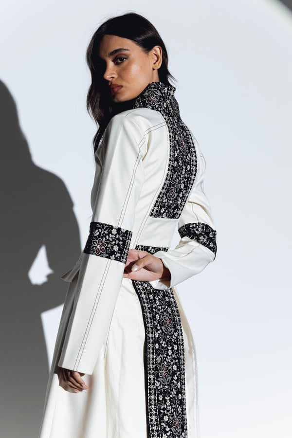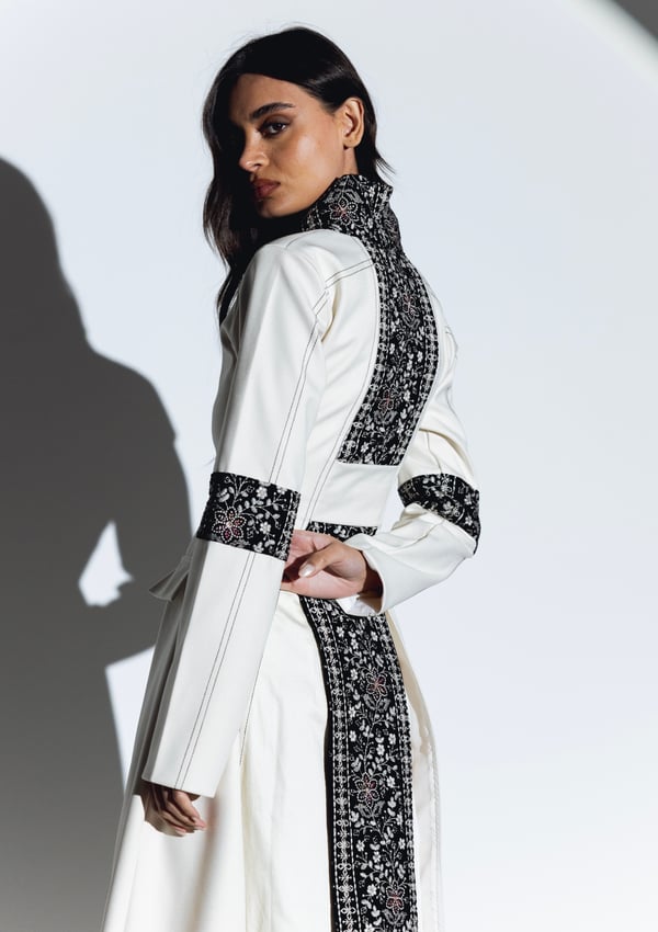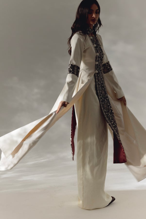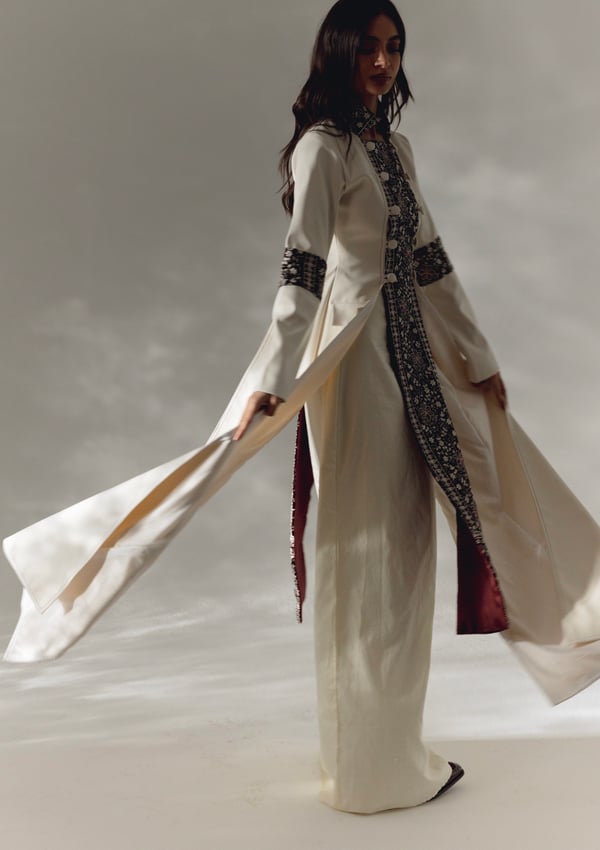 -Top dress: crafted from a thick material in a complementary cream hue. This outer layer boasts a sophisticated design that elevates the overall look. The neckline is elegantly adorned with plush velvet detailing. The velvet extends around the arms and features intricate embroidery in the same cream shade, creating a seamless blend of texture and refinement.
