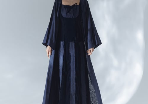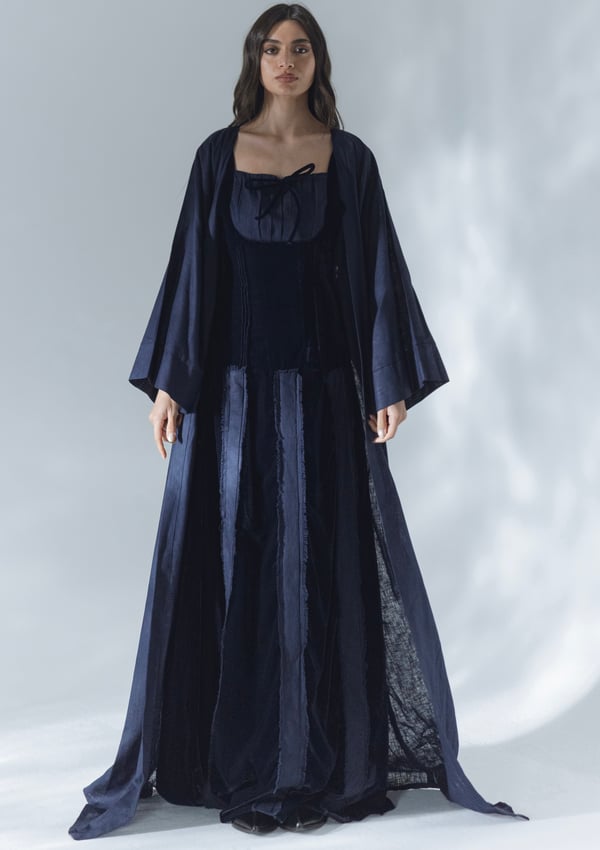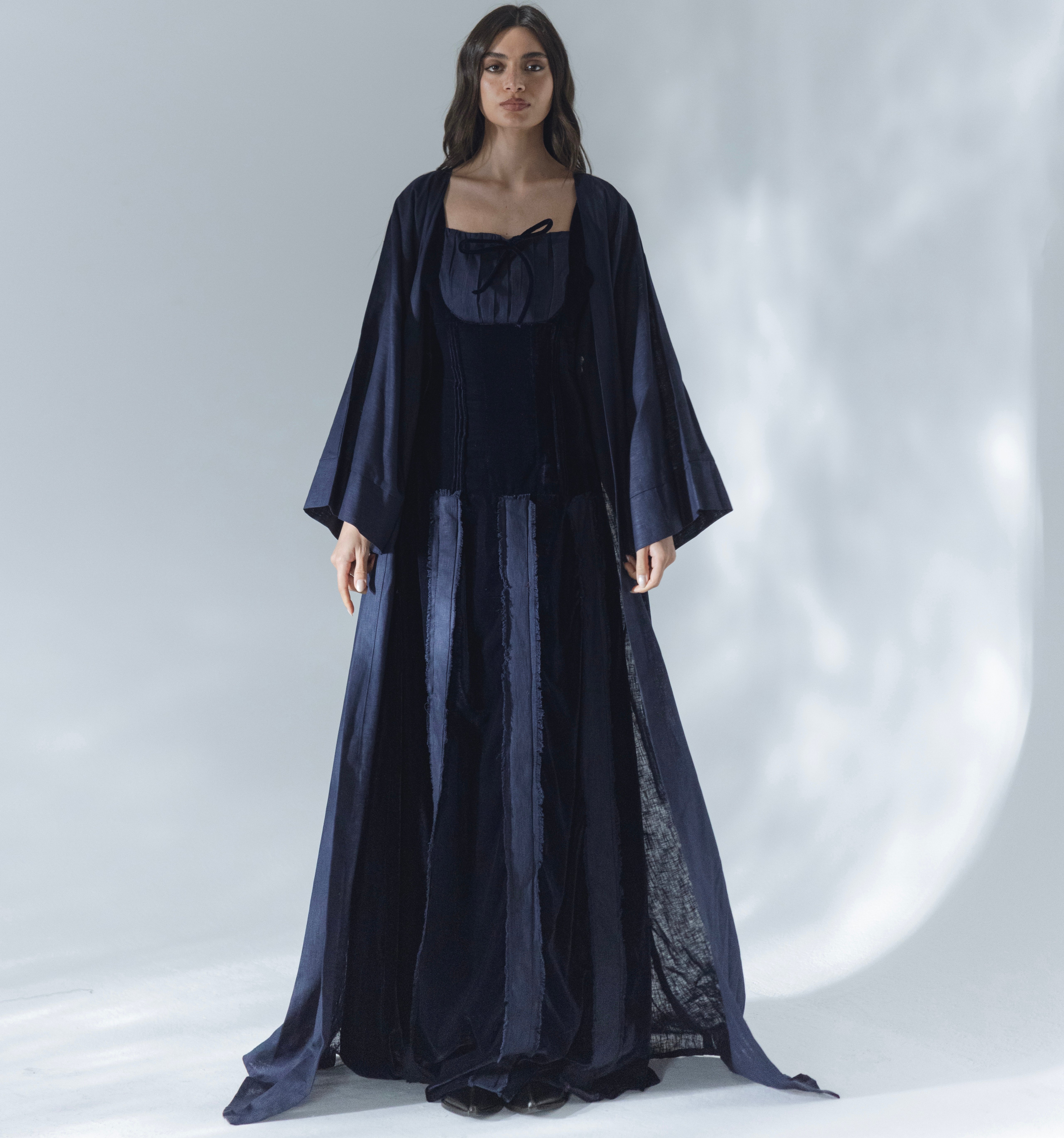 Two piece set featuring a bisht made from navy blue linen fabric, expertly designed with a unique cut that showcases the dress beneath. A matching dress that combines the richness of velvet with the relaxed feel of linen. The upper portion features velvet fabric near the neckline and waistline, adding a touch of texture. The lower part of the dress has navy blue linen with distressed detailing.
