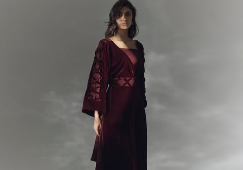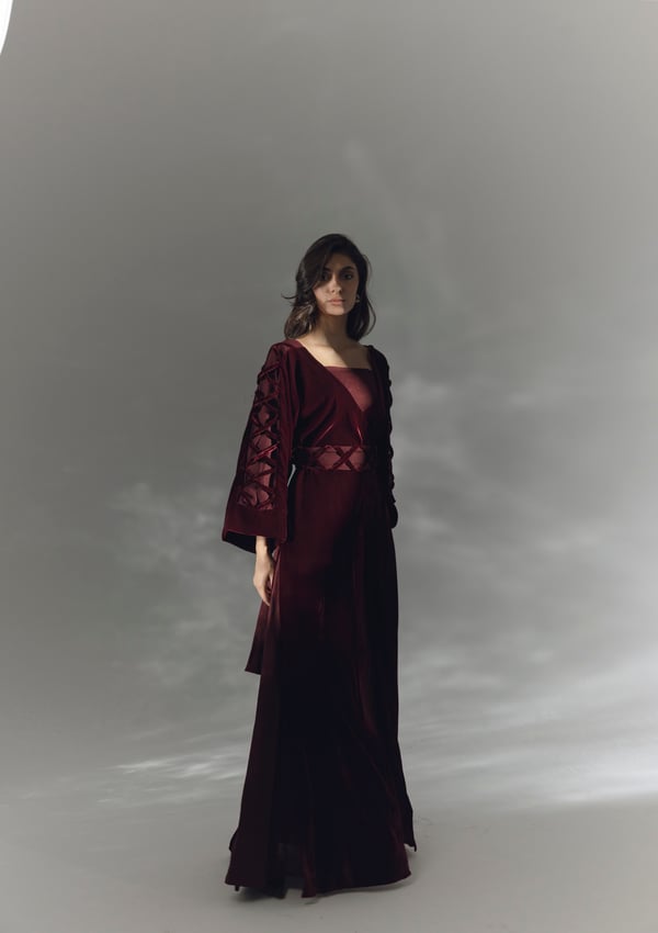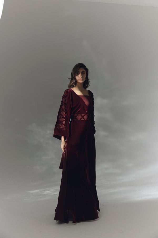 •A set of two-piece features a maroon fitted linen inner dress that serves as a base layer. Over the linen dress, a velvet poncho is layered. The poncho is detailed with velvet X's along the sides of the sleeves. A matching linen belt is included, which can be tied around the waist to enhance the waist line. The belt features velvet X's as decorative details.