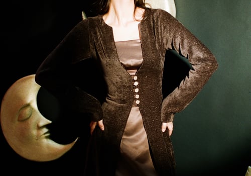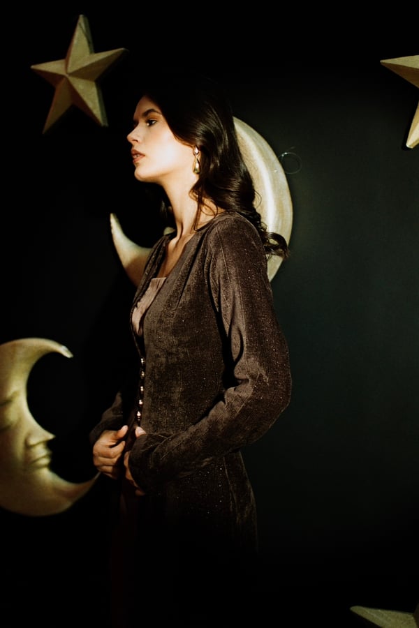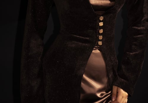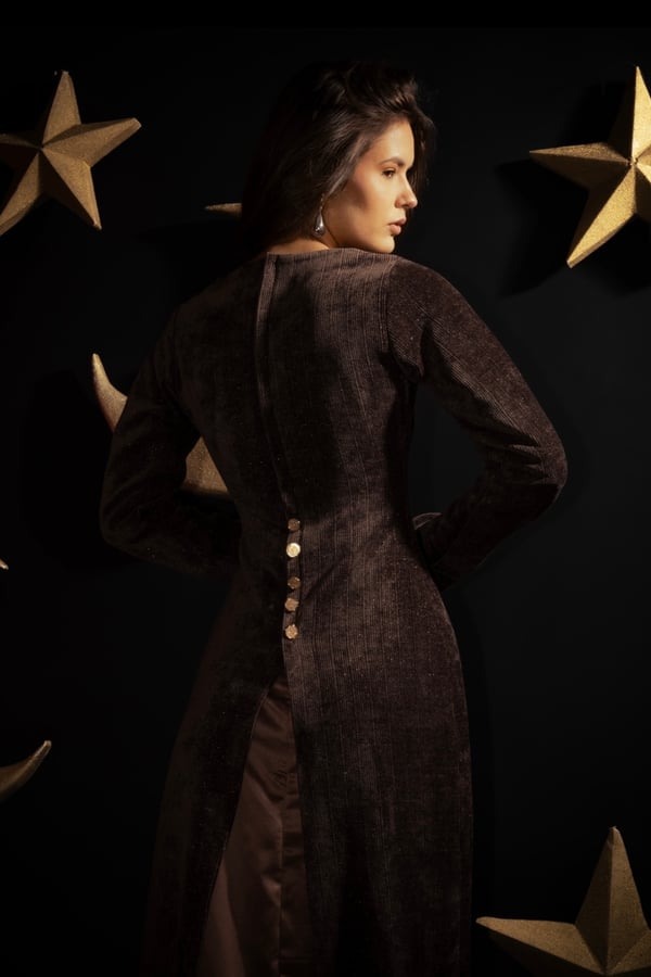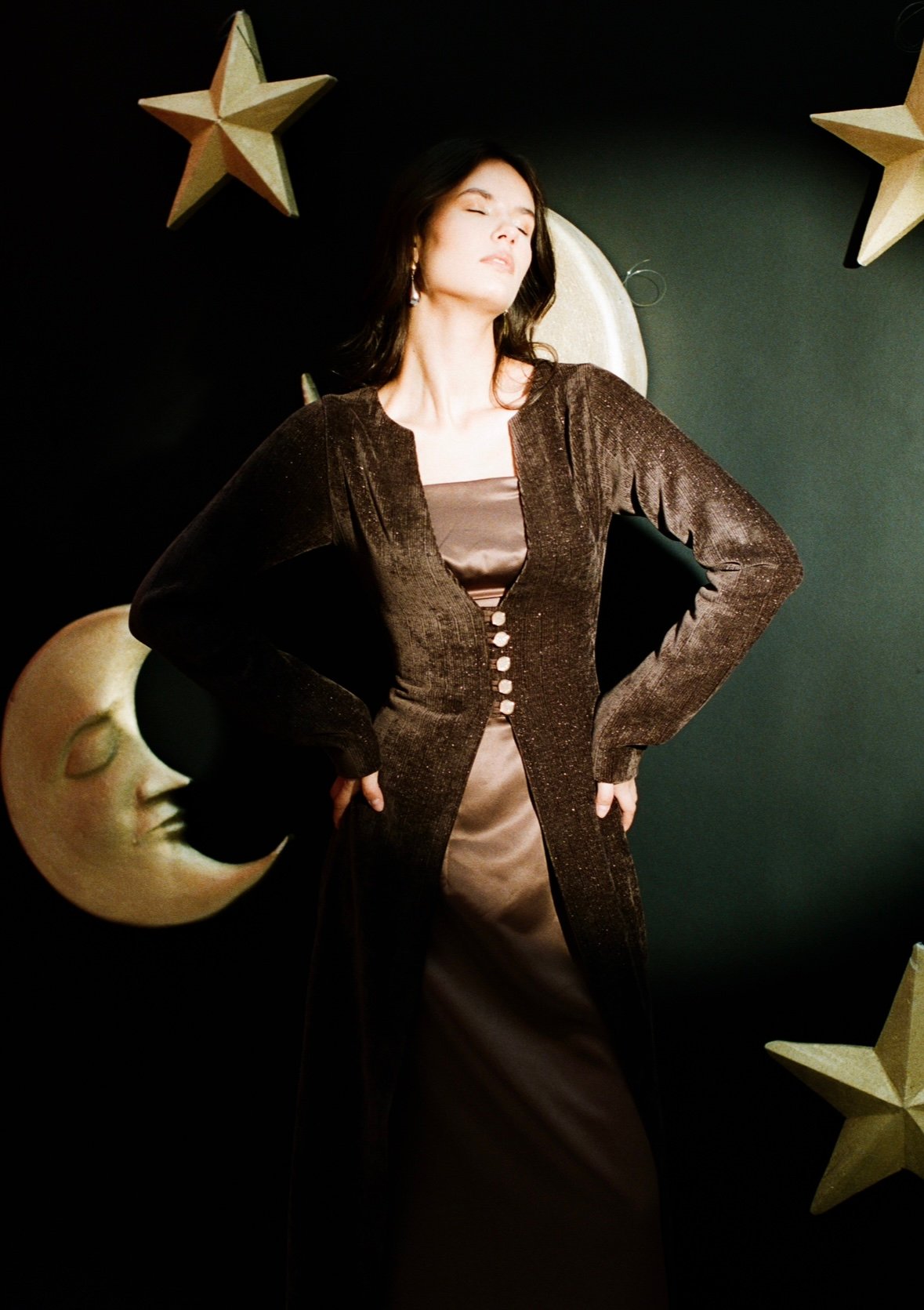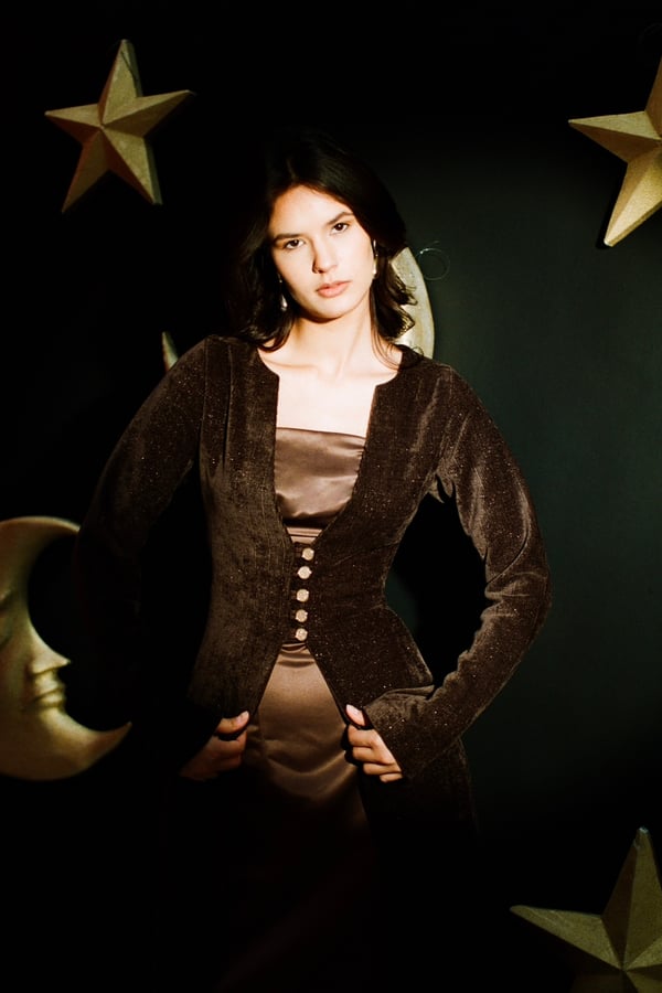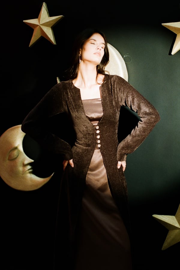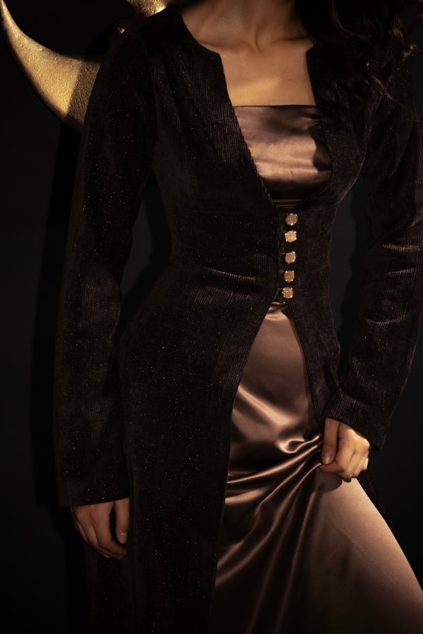 • Two-piece set featuring a sleek satin dress complimented by a textured velvet outer layer.• Gold buttons detail.