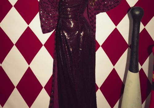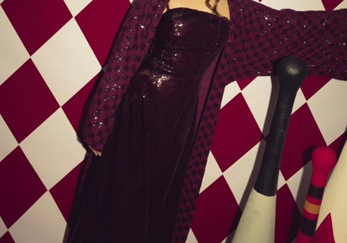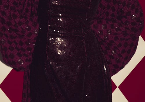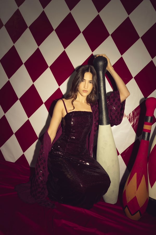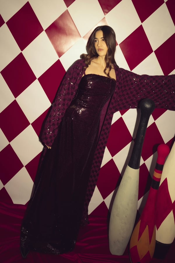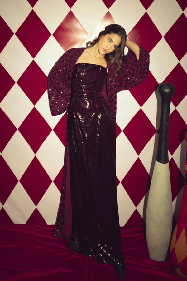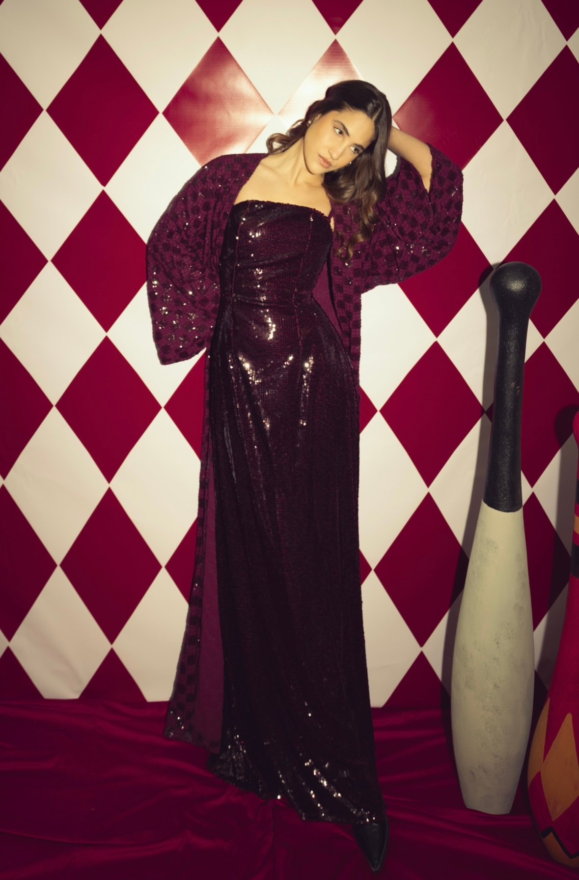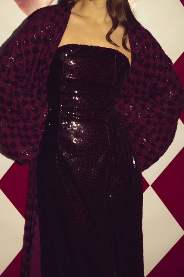 Two-piece set features a gown made of sequin fabric paired with a bisht that has a textured checkered pattern.