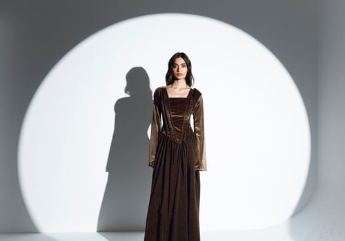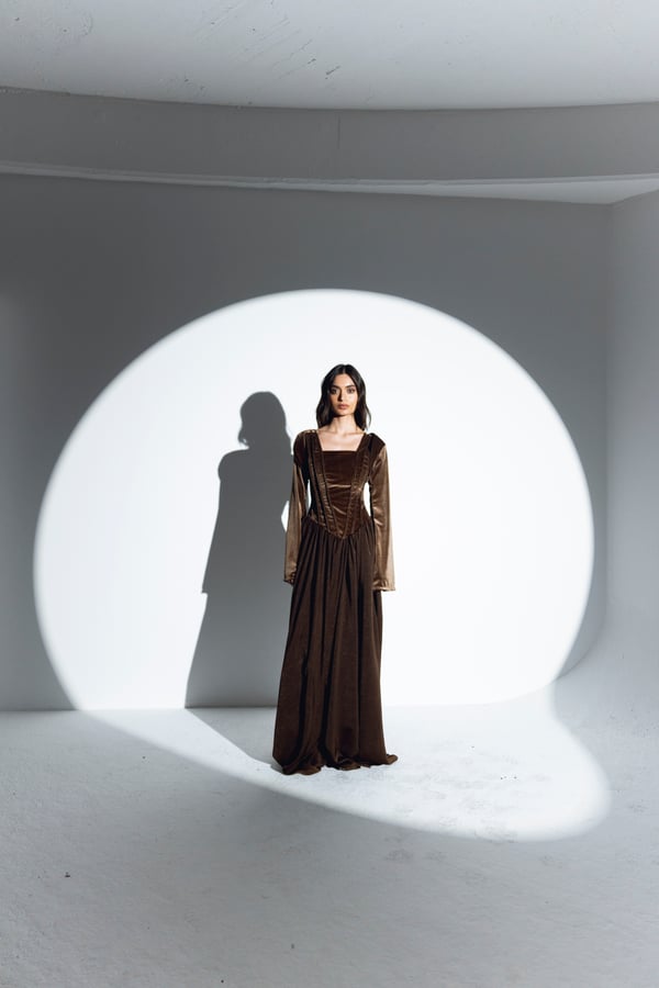 •A set of two-piece features a dress and a cropped velvet javelin. The upper portion of the dress is designed with velvet braids that traverse across the bodice, creating a corset-like effect that enhances the silhouette and adds a touch of vintage charm. Transitioning from the fitted top to the bottom part of the dress flows gracefully in a dark brown silk material.