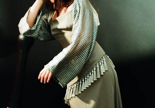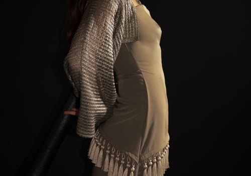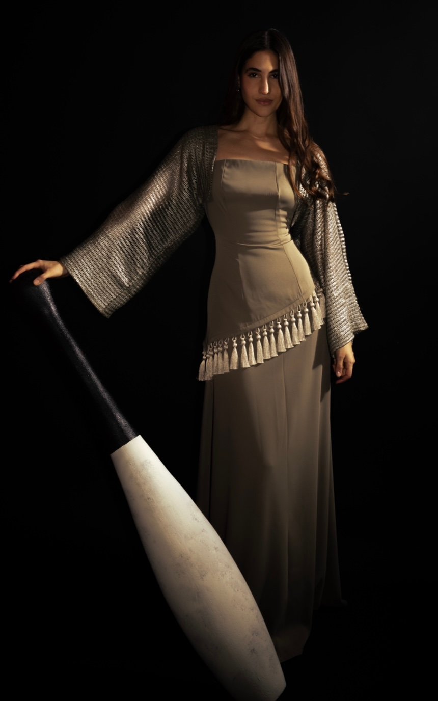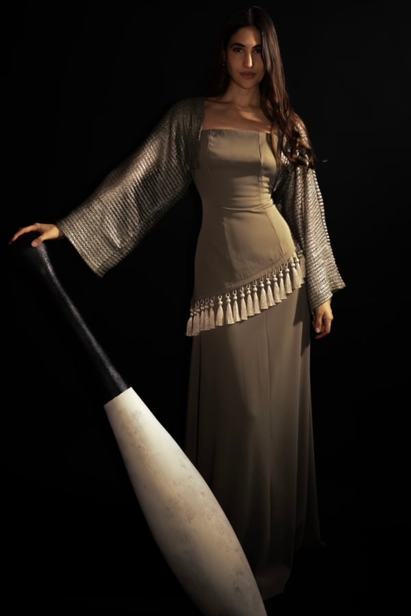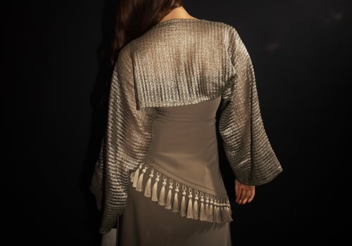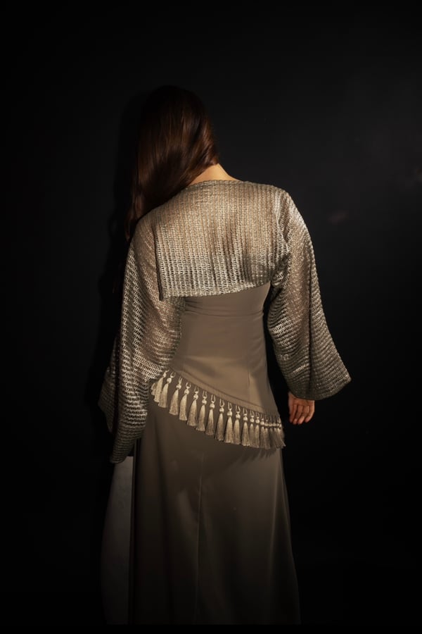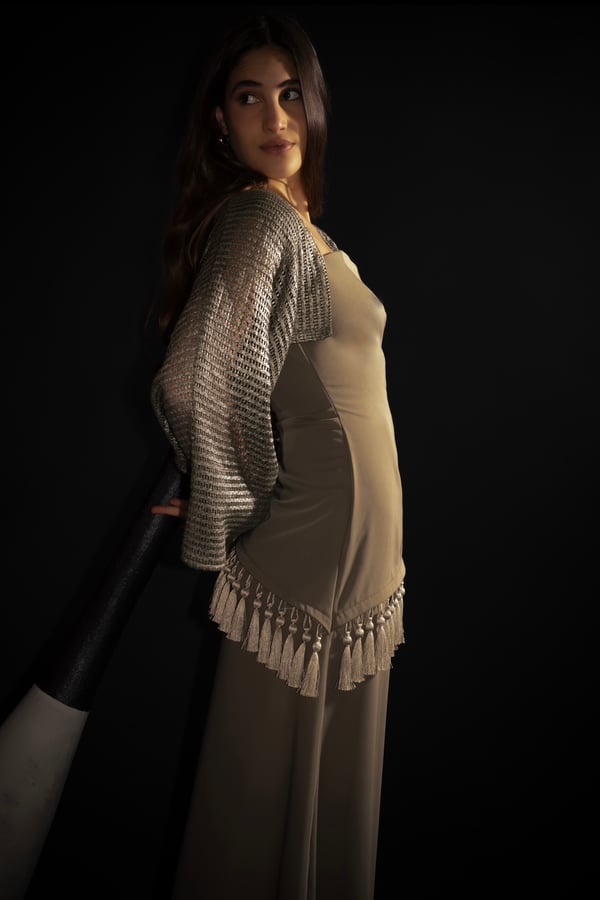 Two-piece set featuring a dress adorned with delicate tassels, paired with a cover-up crafted from a textured fabric in a shimmering silver hue.