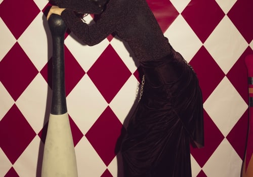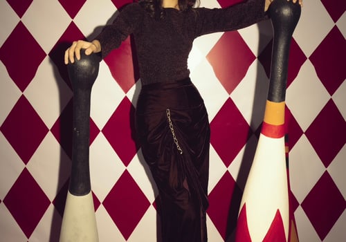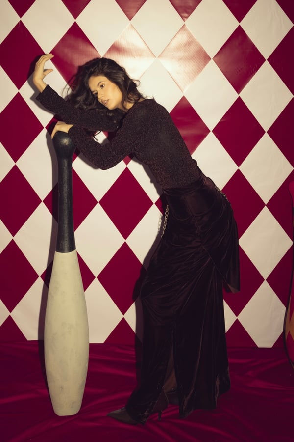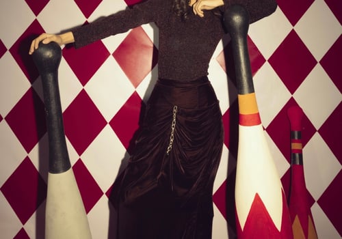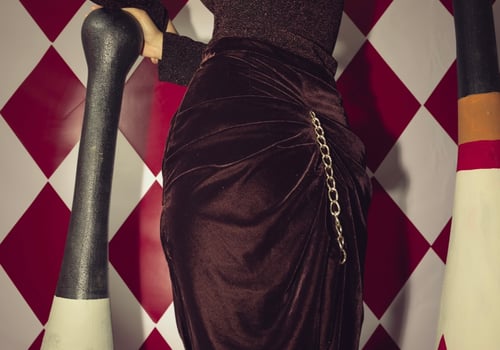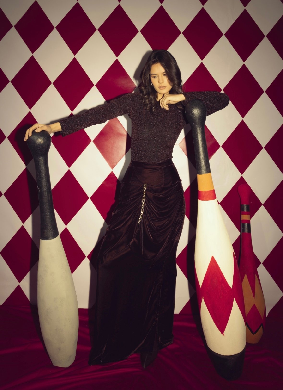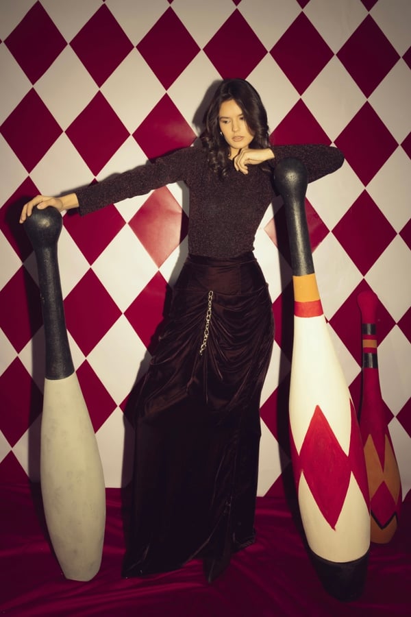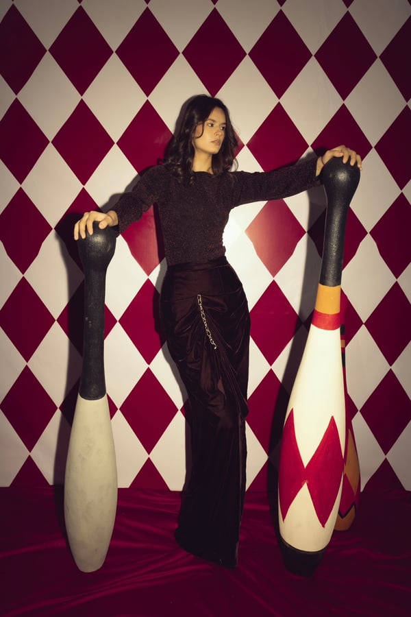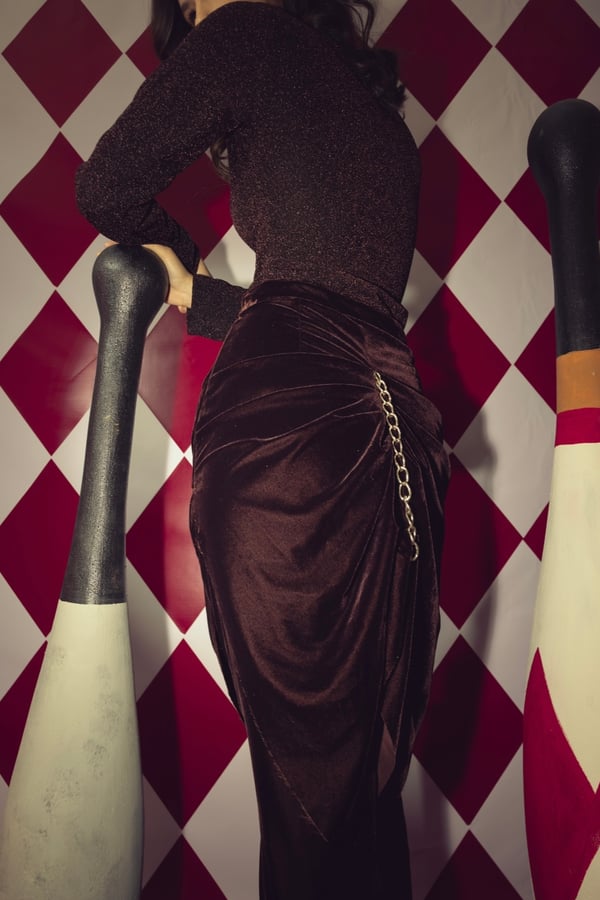 •Skirt is crafted from a luxurious brown velvet features a striking gold chain detail on the front and back. The skirt has a draped design, which adds movement and depth.