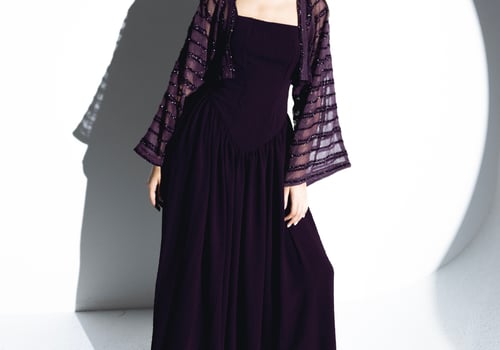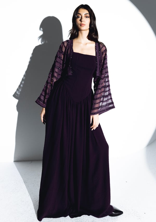 -Two-piece set features a long silhouette that drapes elegantly to the floor. The flowing dress adds movement and dimension in rich purple hue. the flattering cut ensures a perfect fit for various body types.