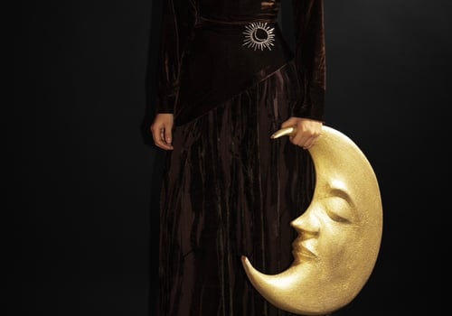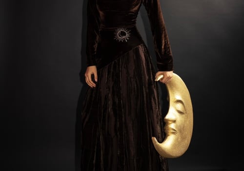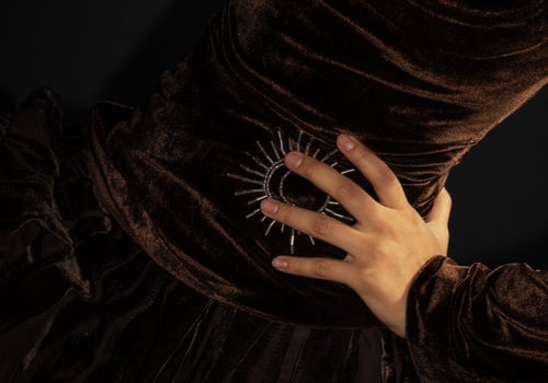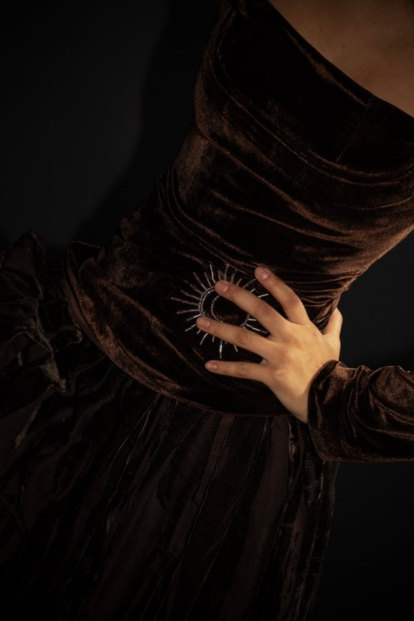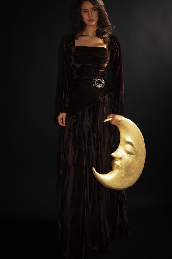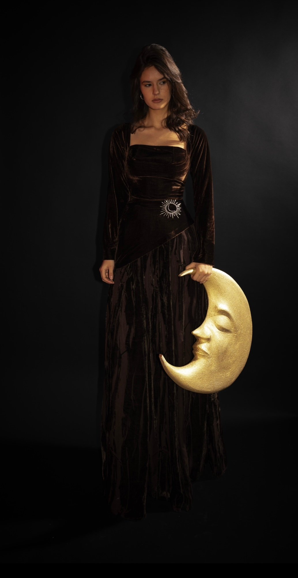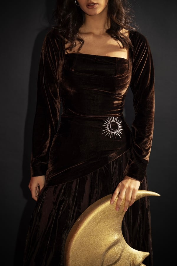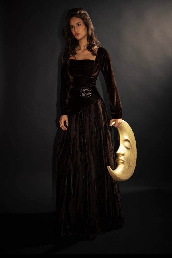 The dress is crafted in brown velvet fabric adorned with silver embroidery detail.