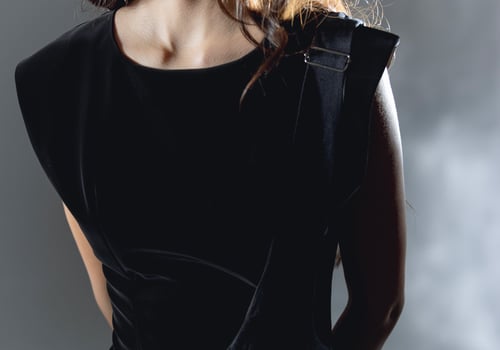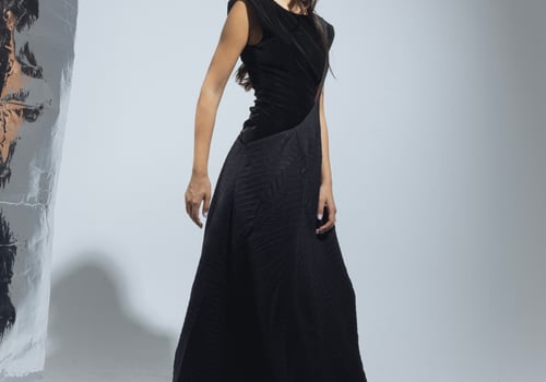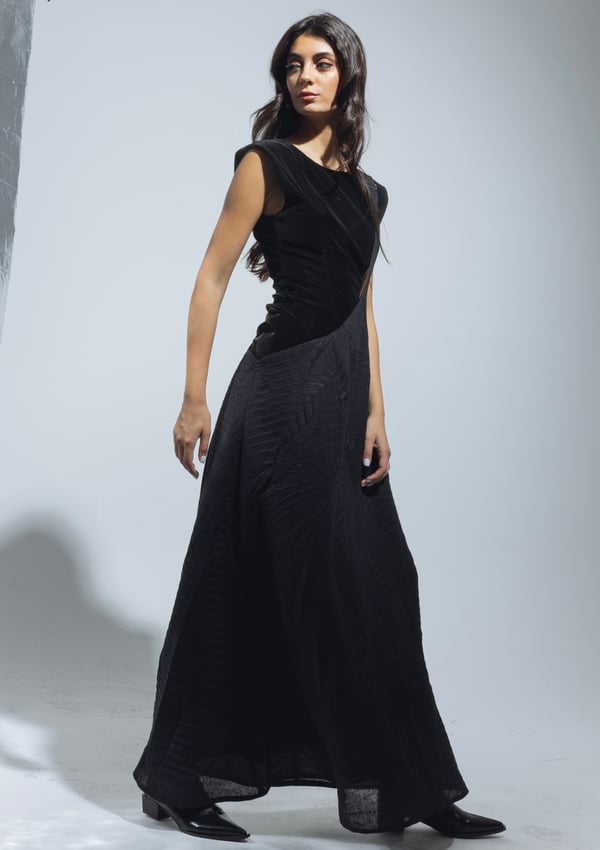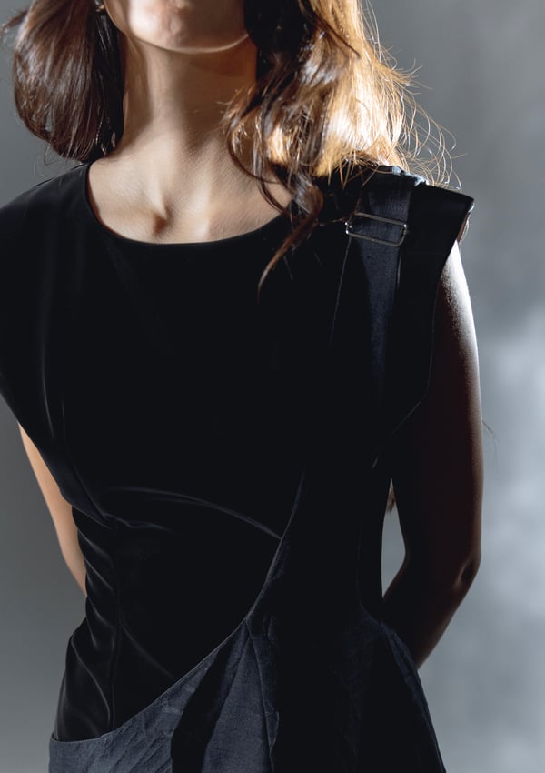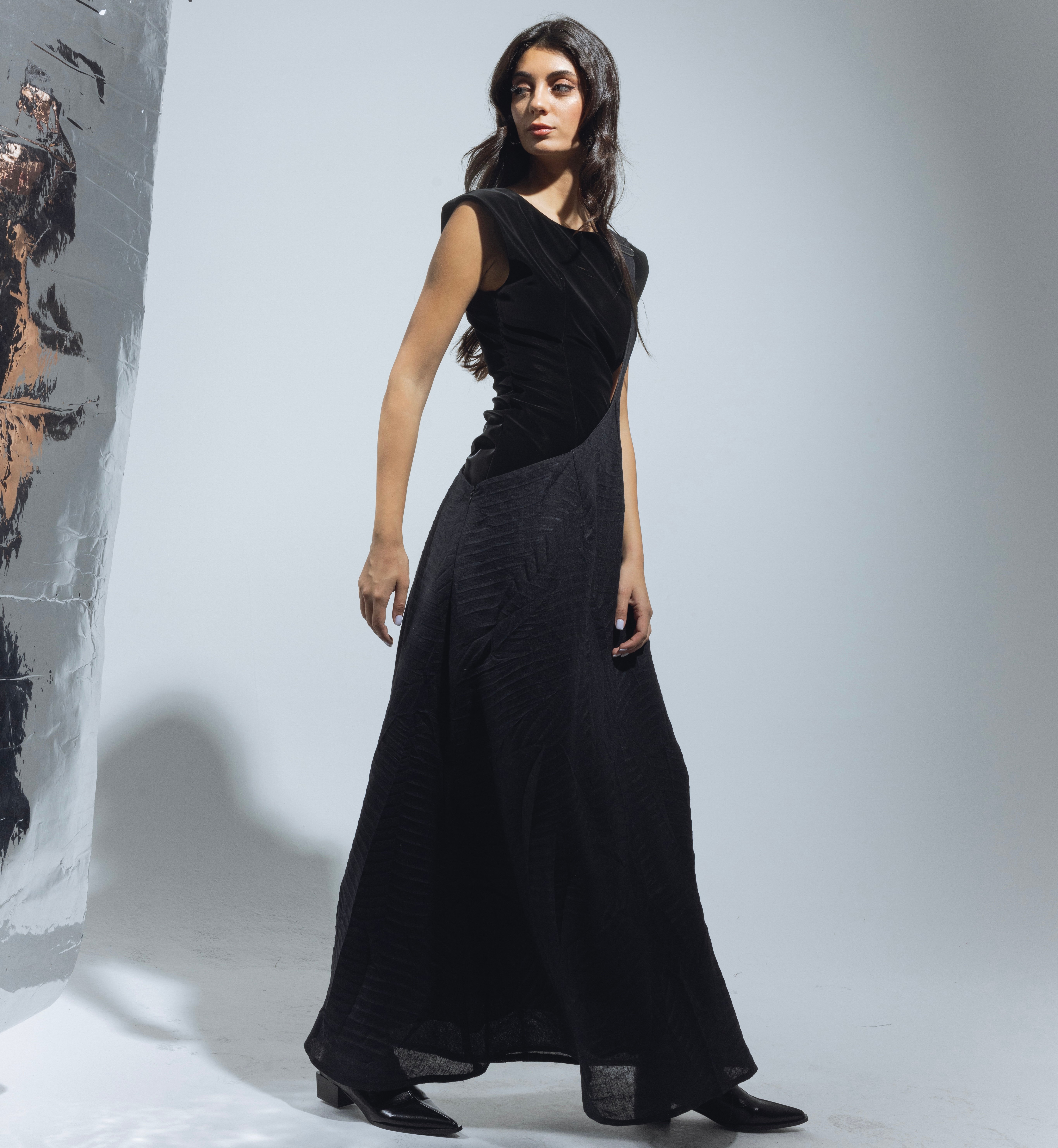 two-piece set features a Crafted velvet-like leather, the top hugs the body for a sleek and tailored silhouette. Paired with the leather top is a beautifully textured linen Trazan dress, with a metal buckle detailing on the shoulder designed to flow effortlessly.