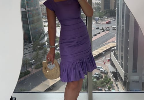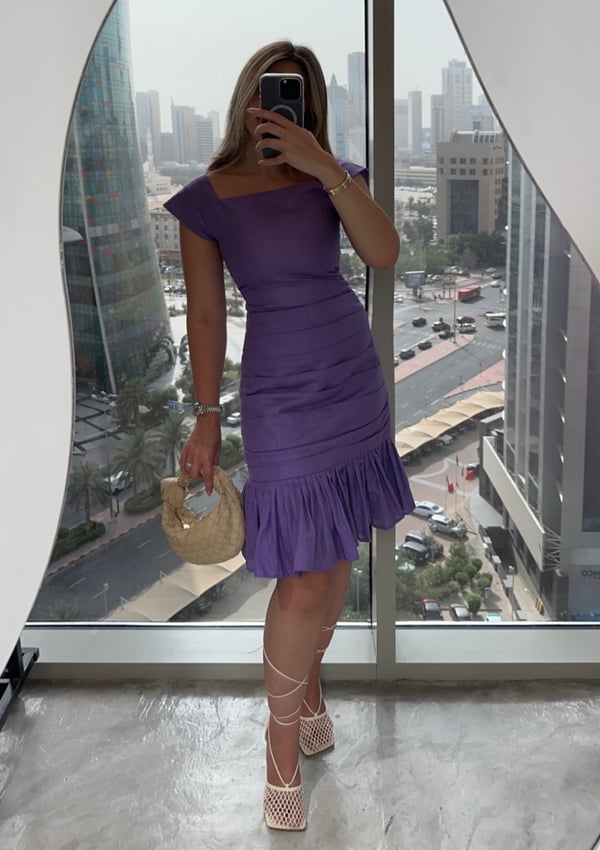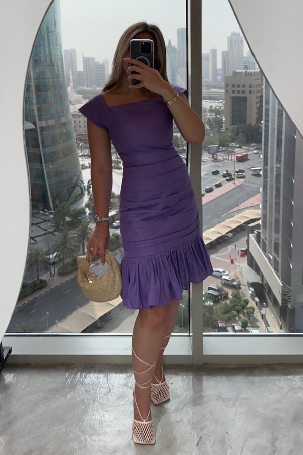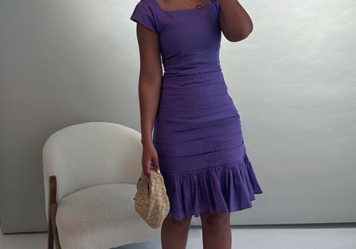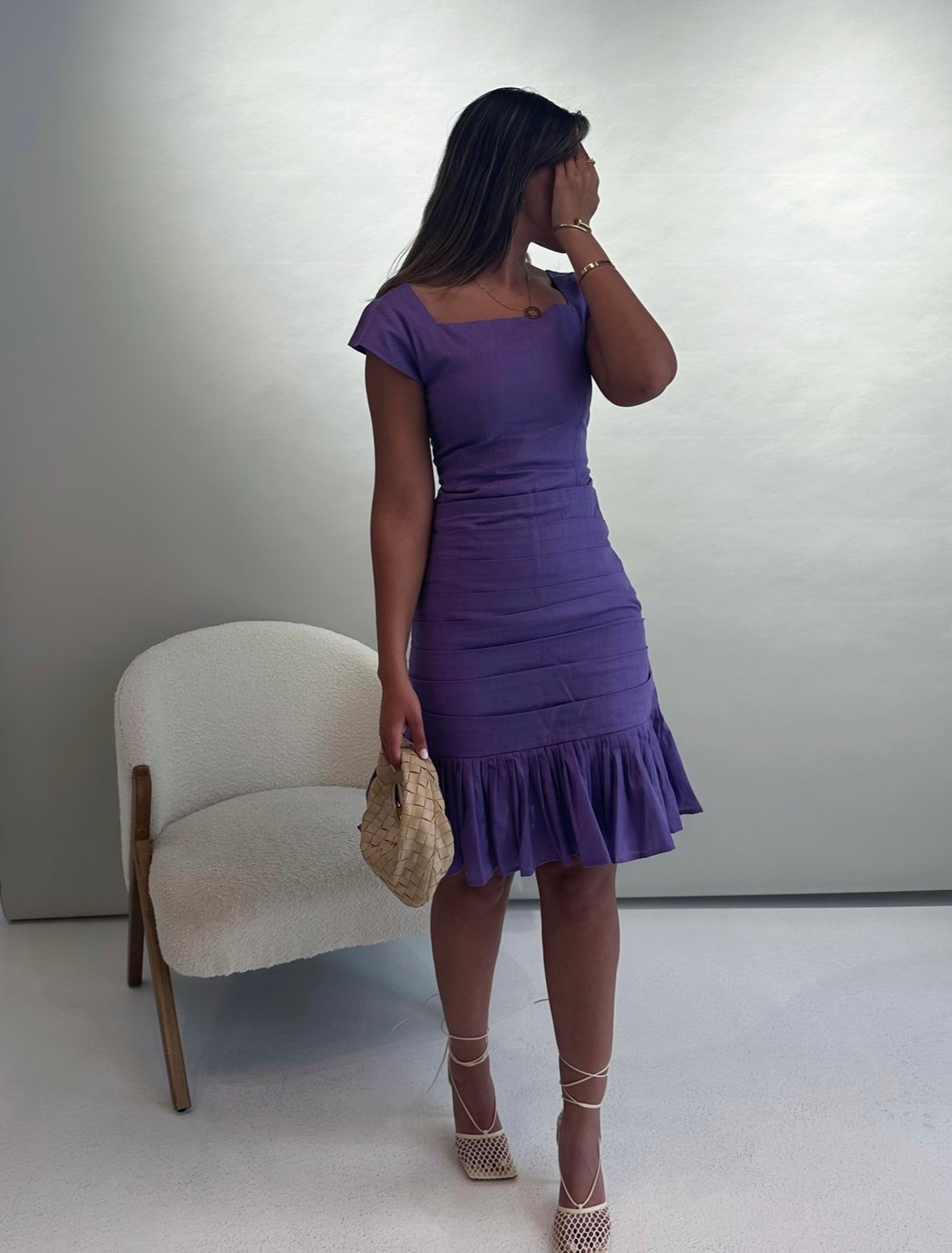 A set of two piece a squared top and a high-waisted skirt in violet color.