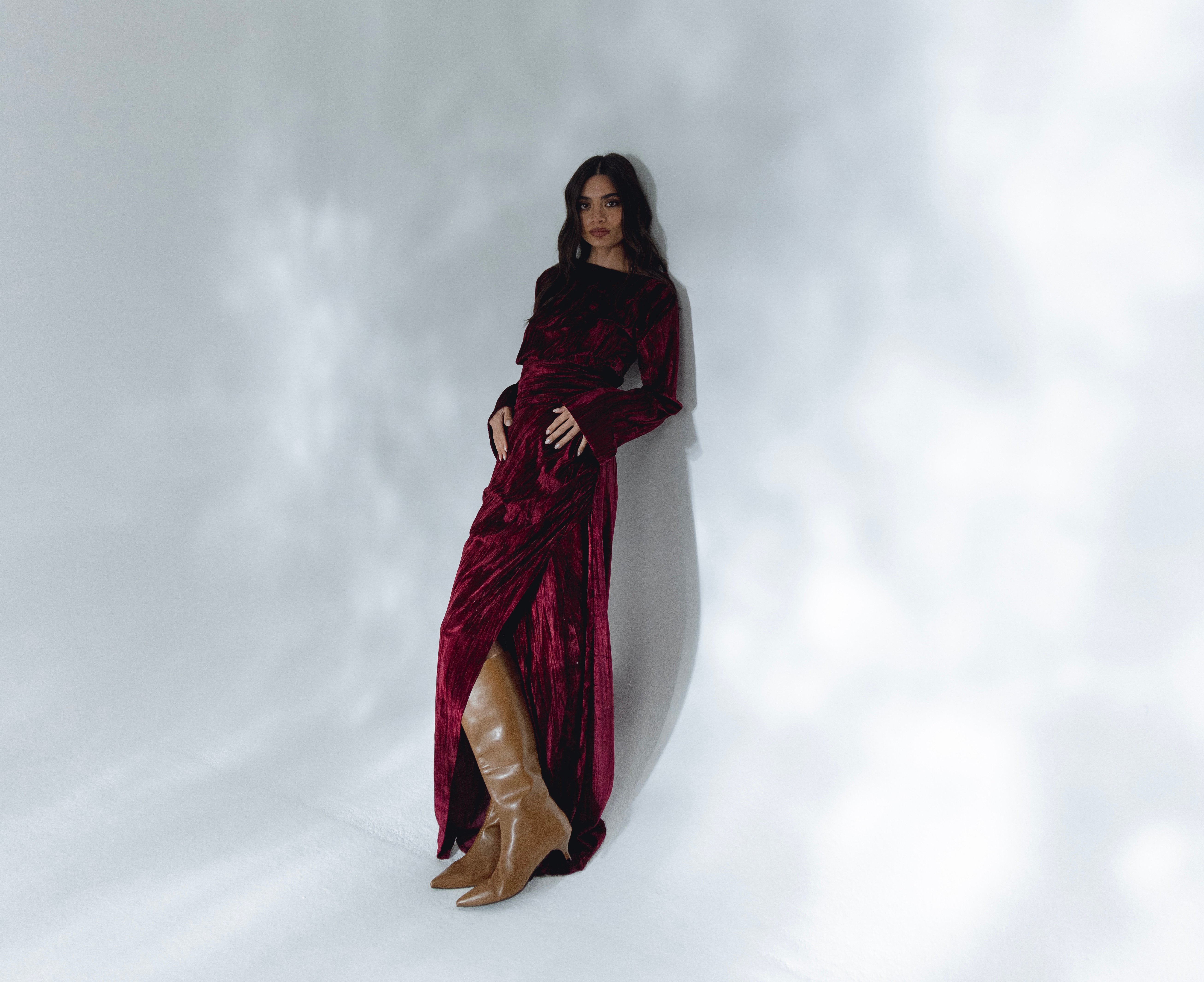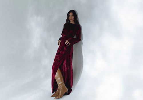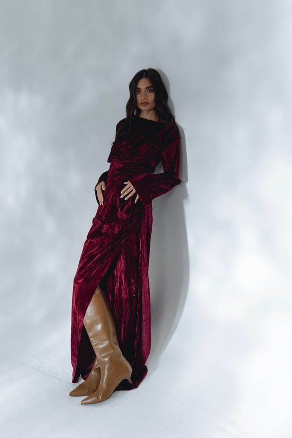 The dress features velvet fabric in rich cherry hue that exudes warmth and vibrancy. The open front design at the front of the dress gives it an edge.