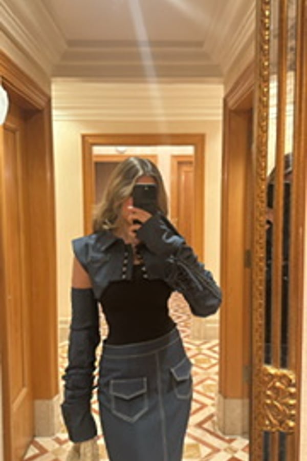 Crop jacket, removable sleeves, detailed skirt with pockets.
