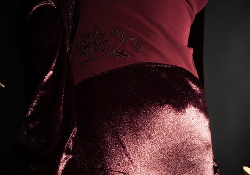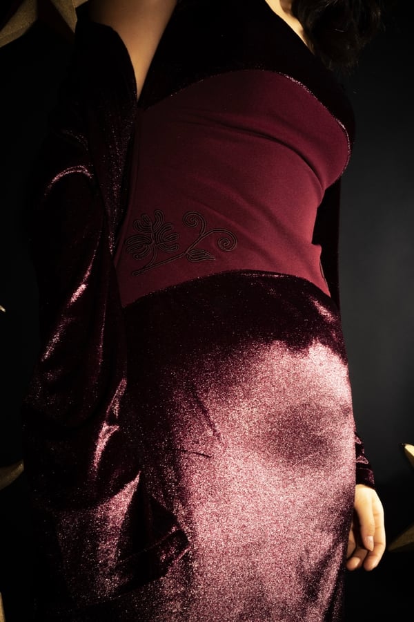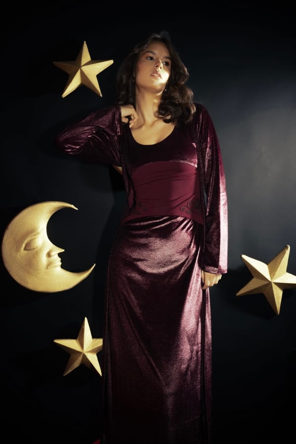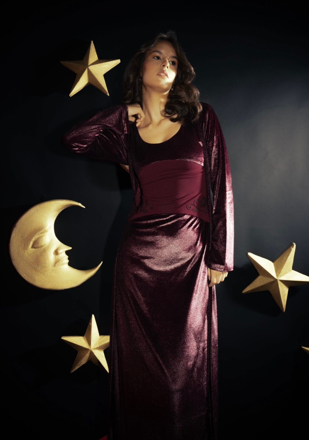 •Two-piece set made from luxurious velvet in a deep burgundy shade.